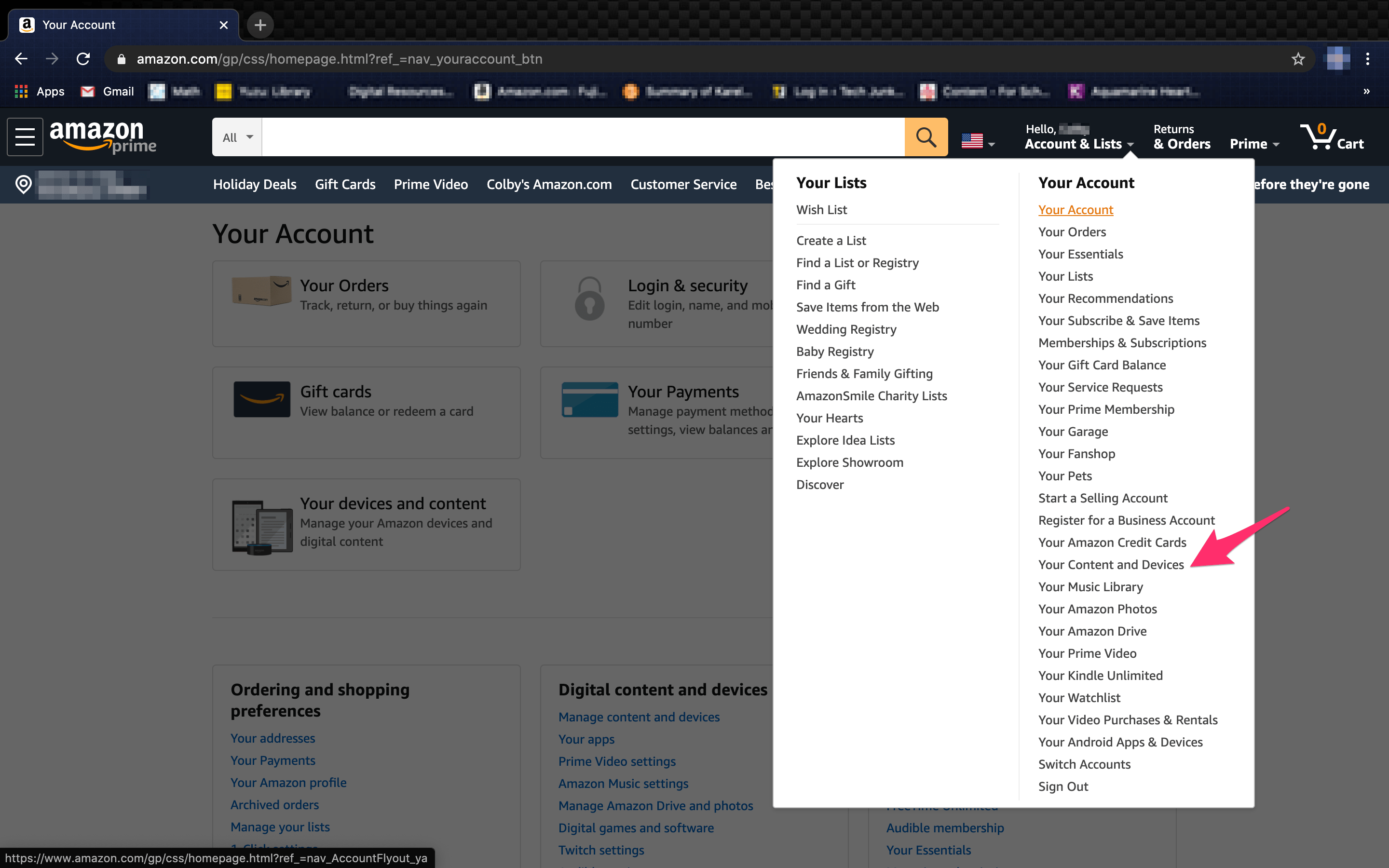- 使用您当前的凭据登录,将光标悬停在“帐户和放大器”上;列表”下拉菜单。选择您的内容和设备。