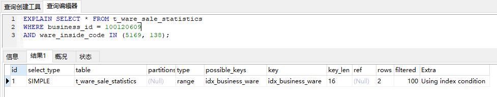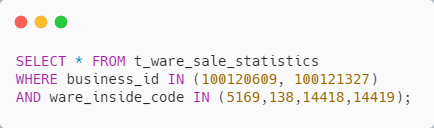 同样是利用 Mybatis 的 动态 SQL ,将 business_id 串列拼在一起、 ware_inside_code 拼在一起,类似如下