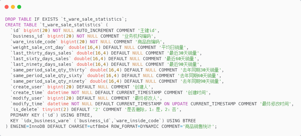 DROP TABLE IF EXISTS `t_ware_sale_statistics`;CREATE TABLE `t_ware_sale_statistics` ( `id` bigint(20) NOT NULL AUTO_INCREMENT COMMENT '主键id', `business_id` bigint(20) NOT NULL COMMENT '业务机构编码', `ware_inside_code` bigint(20) NOT NULL COMMENT '商品自编码', `weight_sale_cnt_day` double(16,4) DEFAULT NULL COMMENT '平均日销量', `last_thirty_days_sales` double(16,4) DEFAULT NULL COMMENT '最近30天销量', `last_sixty_days_sales` double(16,4) DEFAULT NULL COMMENT '最近60天销量', `last_ninety_days_sales` double(16,4) DEFAULT NULL COMMENT '最近90天销量', `same_period_sale_qty_thirty` double(16,4) DEFAULT NULL COMMENT '去年同期30天销量', `same_period_sale_qty_sixty` double(16,4) DEFAULT NULL COMMENT '去年同期60天销量', `same_period_sale_qty_ninety` double(16,4) DEFAULT NULL COMMENT '去年同期90天销量', `create_user` bigint(20) DEFAULT NULL COMMENT '创建人', `create_time` datetime NOT NULL DEFAULT CURRENT_TIMESTAMP COMMENT '创建时间', `modify_user` bigint(20) DEFAULT NULL COMMENT '最终修改人', `modify_time` datetime NOT NULL DEFAULT CURRENT_TIMESTAMP ON UPDATE CURRENT_TIMESTAMP COMMENT '最终修改时间', `is_delete` tinyint(2) DEFAULT '2' COMMENT '是否洗掉,1:是,2:否', PRIMARY KEY (`id`) USING BTREE, KEY `idx_business_ware` (`business_id`,`ware_inside_code`) USING BTREE) ENGINE=InnoDB DEFAULT CHARSET=utf8mb4 ROW_FORMAT=DYNAMIC COMMENT='商品销售统计';