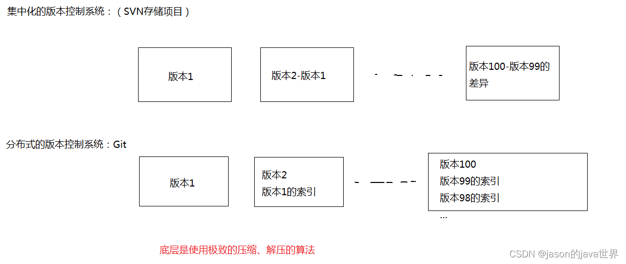 分布式的版本控制系统在管理项目时存放的不是项目版本与版本之间的差异.它存的是索引(所需磁盘空间很少所以每个客户端都可以放下整个项目的历史记录)
