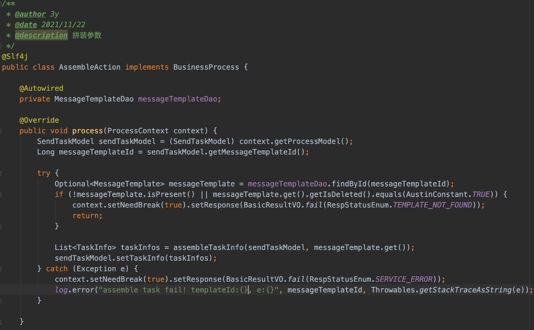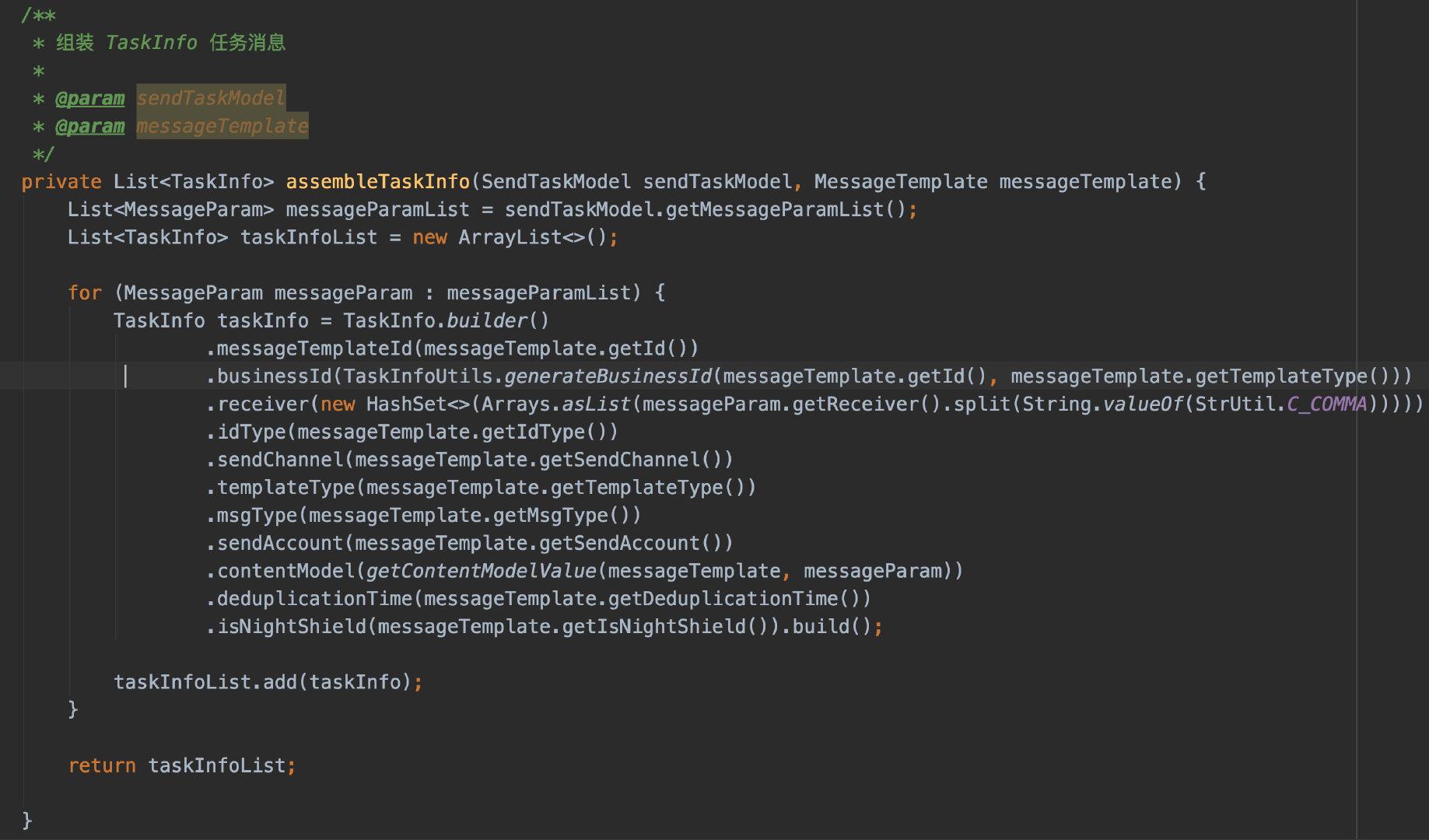 接着来看自变量拼装,这块主要就是通过模板ID去查整个模板的内容,然后根据业务入参拼装出自己的TaskInfo(任务讯息),