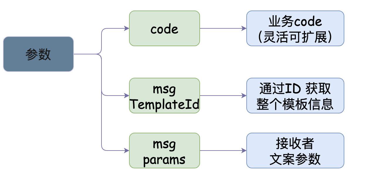 通过messageTemplateId可以去数据库查出整个模板的信息,而MessageParam则是业务自行传入的自变量(重要的是接收者以及文案的自变量信息),而code则代表着当前请求要执行什么业务型别的(可基于该code扩展,后面会继续聊到)