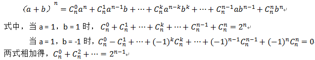 小明刚学了组合数,现在他很想知道sigma(C(n,i))是多少;其中C是组合数(即C(n,i)表示n个物品无顺序选取i个的方案数),i取从0到n所有偶数,